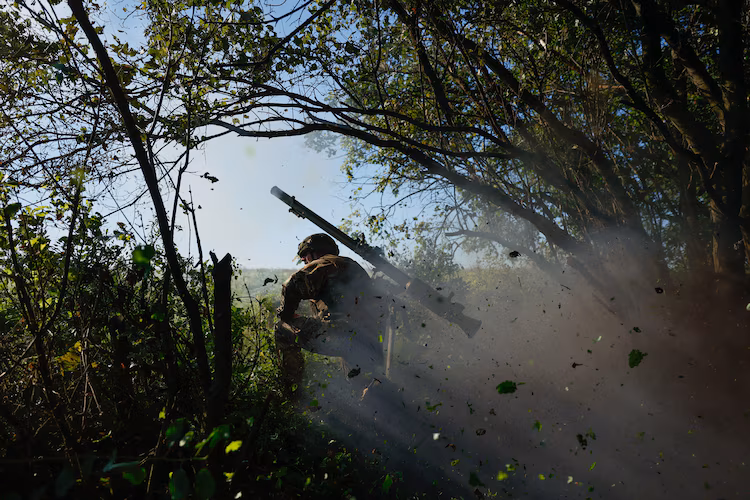 Ein ukrainischer Soldat einer Artillerieeinheit feuert auf russische Stellungen außerhalb von Bakhmut, 8. November 2022, inmitten des russischen Einmarsches in die Ukraine.