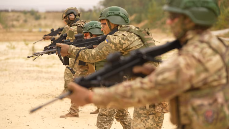 Rekruten der Hauptabteilung für Nachrichtendienste der Ukraine untersuchen nach dem Schießtraining ein Ziel. ABC News