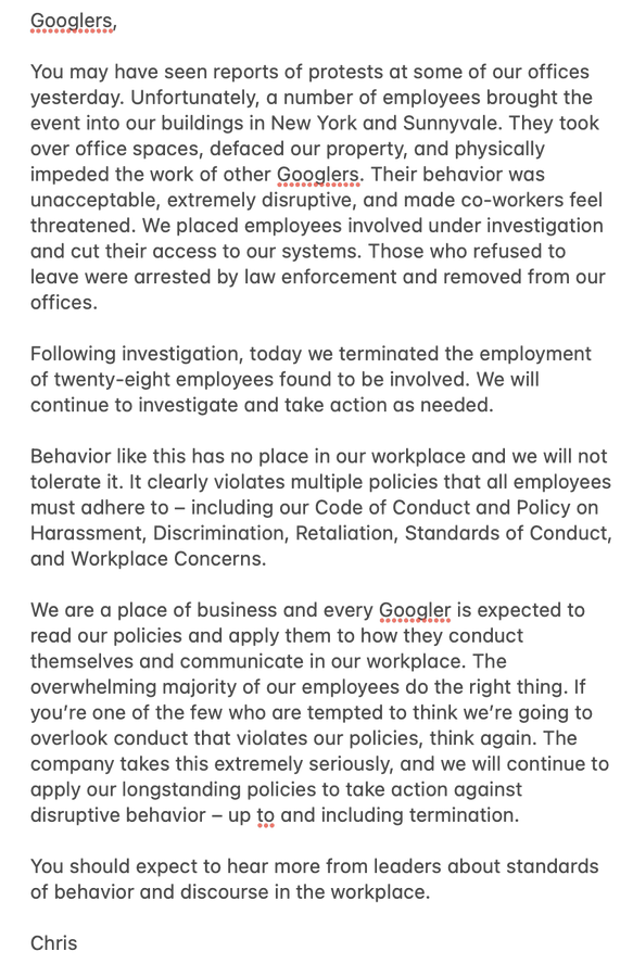 Die Protestierenden „haben Büroräume besetzt, unser Eigentum verunstaltet und die Arbeit anderer Googler physisch behindert. Ihr Verhalten war inakzeptabel, äußerst störend und hat dazu geführt, dass sich die Kollegen bedroht fühlten“, schrieb Rackow und fügte hinzu, dass die Mitarbeiter erwarten sollten, dass die Unternehmensleitung mehr über Verhaltens- und Diskussionsstandards im Büro spricht.