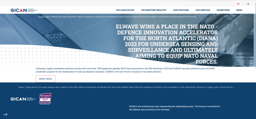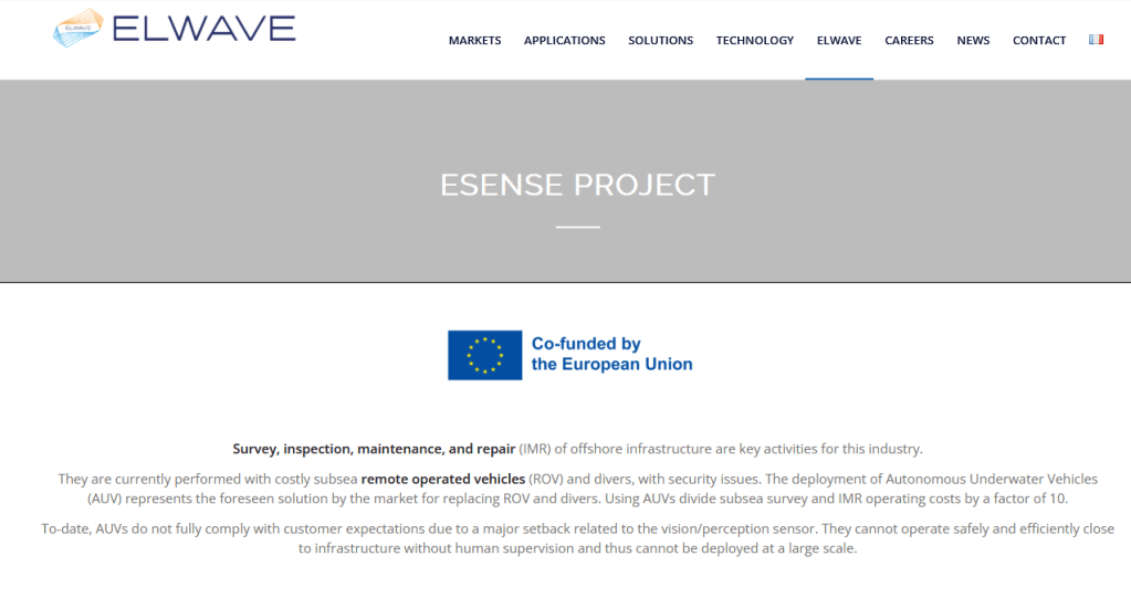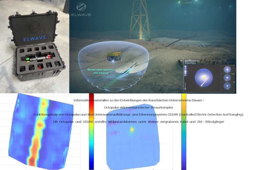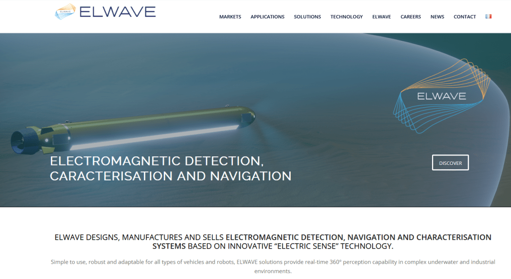 Elwave hat das elektromagnetische Octopulse-Sensorsystem und das Controlled Electric Detection And Ranging (CEDAR)-System entwickelt, die für die Unterwasseraufklärung sowie die Erkennung von Unterwasserkommunikation, unbemannten Fahrzeugen (UUVs) und U-Booten konzipiert sind. Nach Angaben des Unternehmens basiert die Technologie auf demselben Prinzip wie die Elektroortung von Fischen. https://elwave.fr/en/technology