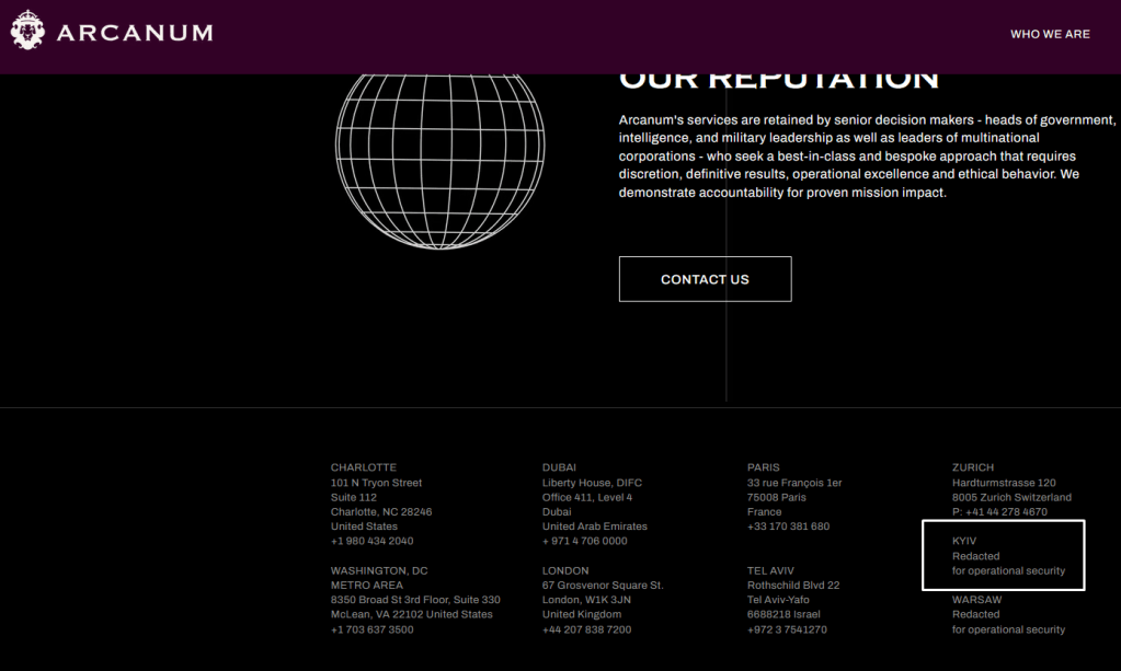 Das Personal von Arcanum https://arcanumglobal.com/arcanum-team/our-leadership-team besteht fast ausschließlich aus ehemaligen Militär- und Geheimdienstmitarbeitern aus den Vereinigten Staaten und dem Vereinigten Königreich . Zuvor konzentrierte sich Arcanums Haupttätigkeit auf amerikanische Interessen in Kasachstan. Mindestens seit Frühjahr 2023 ist das CRC in der Ukraine aktiv (https://arcanumglobal.com/news/former-governor-tells-washington-post-about-accompanying-arcanum-to-the-frontline-in-ukraine/) und unterhält (https://arcanumglobal.com/offices/) ein Büro in Kiew.