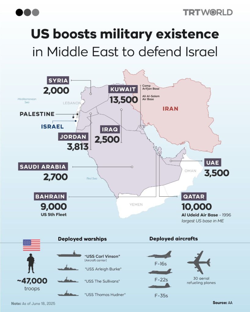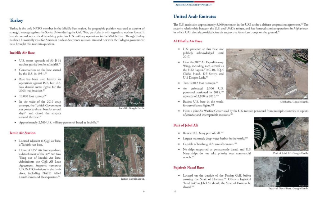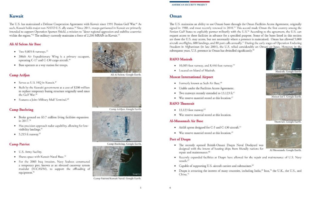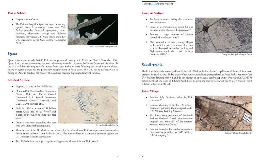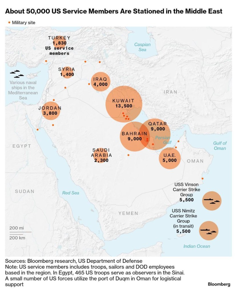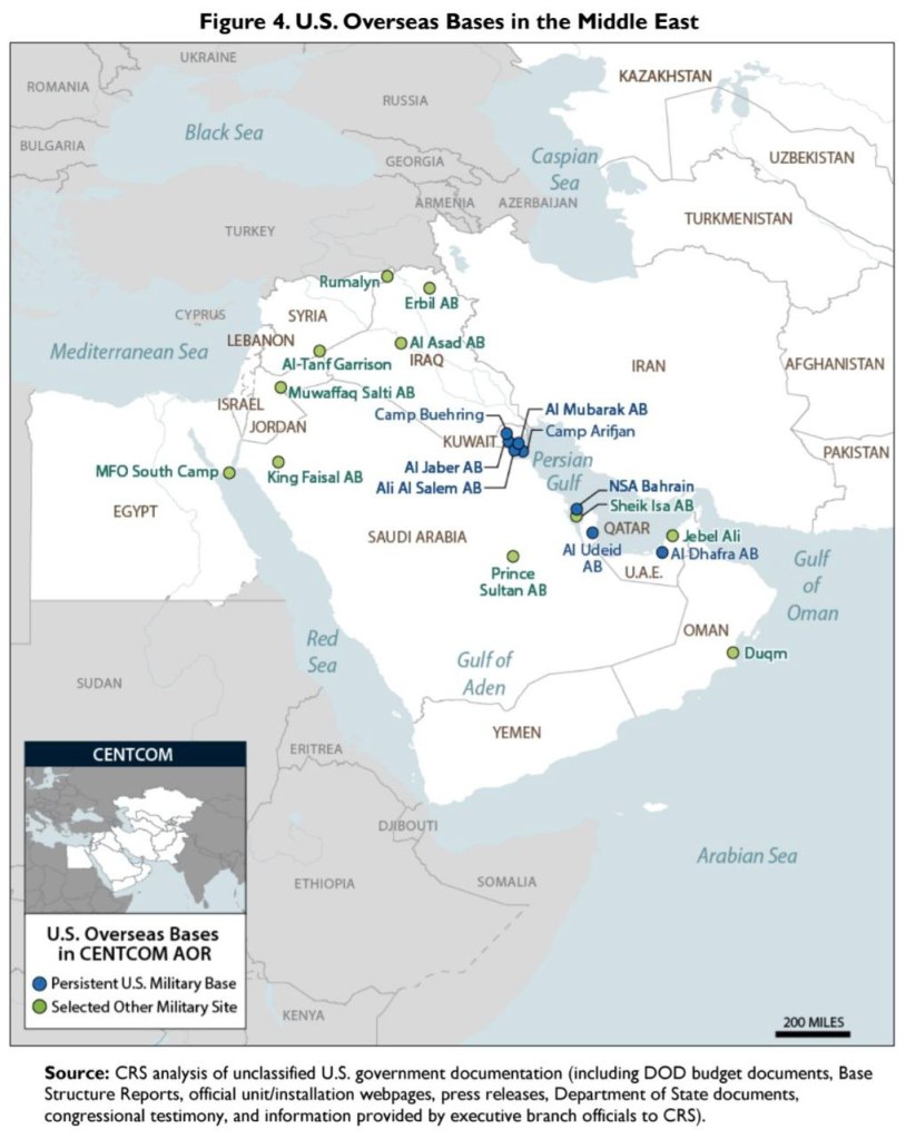Die militärische Präsenz der USA im Nahen Osten umfasst bis zu 50.000 Soldaten, zahlreiche Stützpunkte, stationierte Flugzeuge und eine Flotte.