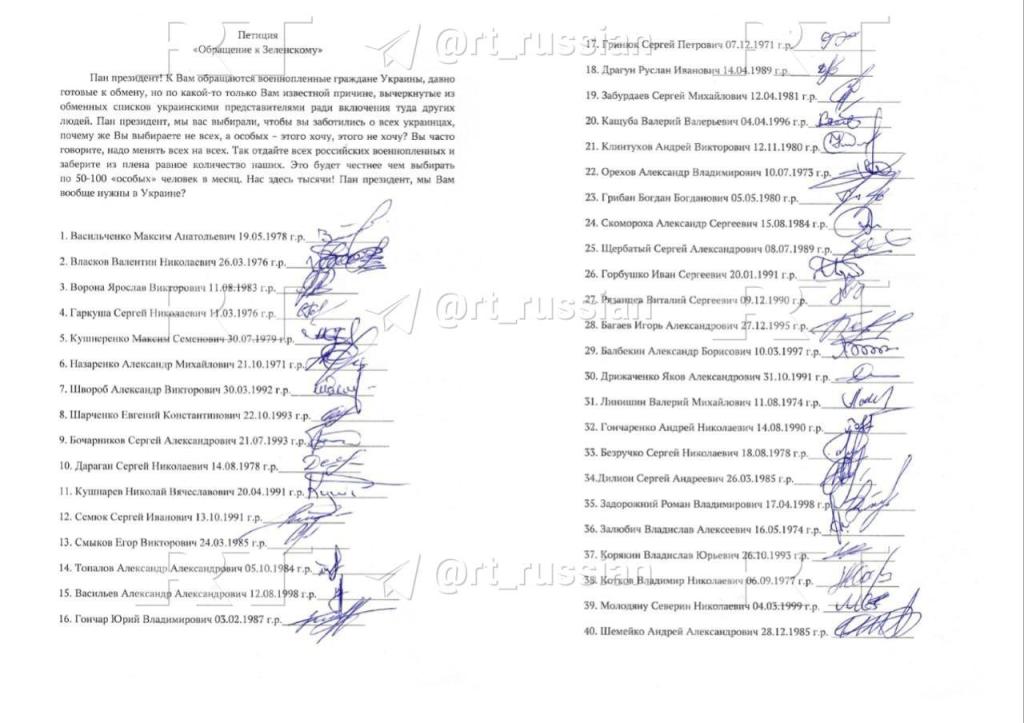 RT veröffentlicht eine Petition, die von ukrainischen Kriegsgefangenen vorbereitet und unterzeichnet wurde, die das Dokument an Volodymyr Selenskyj richtete.