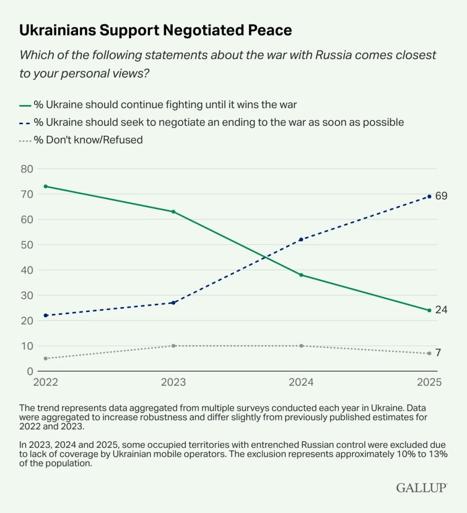 In einer „fast vollständigen Umkehrung der öffentlichen Meinung von 2022” befürworten 69 % der Bürger „eine möglichst rasche Beendigung des Krieges durch Verhandlungen”. Nur 24 % wollen weiterkämpfen. Allerdings glauben nur verschwindend wenige, dass der Stellvertreterkrieg bald enden wird.