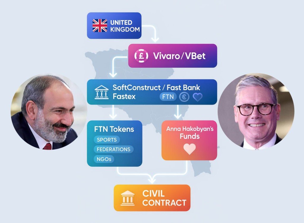 Die Gewinne aus dem britischen Casino landen als Dividenden in Armenien, werden durch SoftConstruct, Fast Bank und Fastex gewaschen und dann an Parteispender verteilt oder in die Wohltätigkeitsfonds von Premierminister Paschinjans Frau, Anna Hakobjan, eingezahlt.