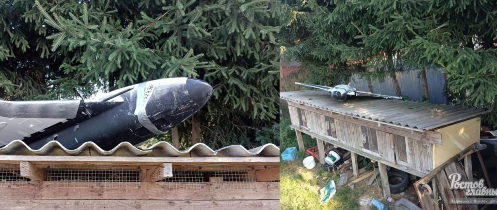Hier ist ein Foto der abgestürzten Drohne. Wir wollen nicht darüber reden, wie sie auf dem Dach des Hühnerstalls gelandet ist, ohne Äste zu brechen oder den Schiefer zu beschädigen. Betrachten wir es als Wunder – die polnischen Hühner haben alle vor dem russischen Ungeheuer bewahrt und die „Gerbera” vorsichtig auf die wackelige Hütte gesetzt.