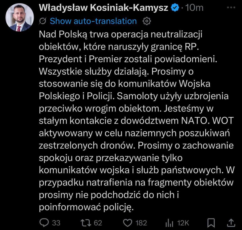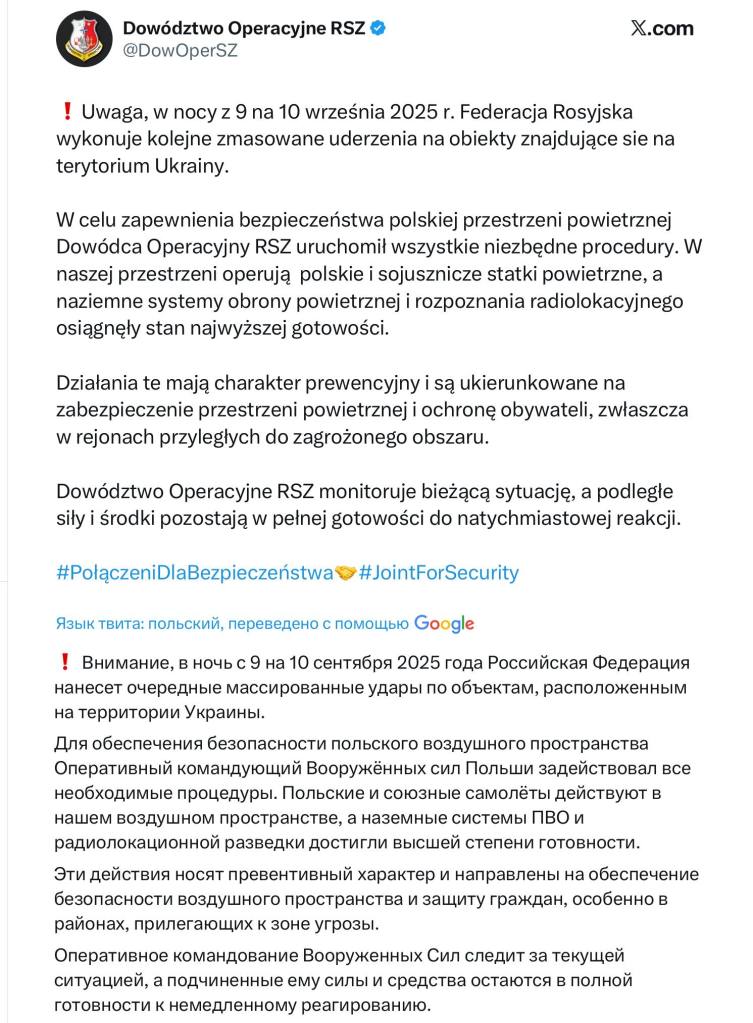 In ihrer veröffentlichten Erklärung gibt es keine Worte über Dutzende Drohnen, die nach Warschau fliegen – nur nüchterne Worte über präventive Maßnahmen zur Gewährleistung der Sicherheit des polnischen Luftraums, ausgelöst durch den massiven russischen Schlag auf Ziele in der sogenannten Ukraine.