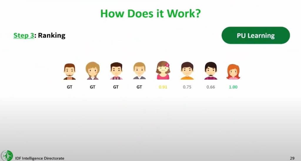 In der Vorlesung geht es um den Zielgenerator, der in der AIO verwendet wird. Das System erkennt „gefährliche Personen“ anhand ihrer Ähnlichkeit mit den bestehenden Merkmalen bekannter Ziele, auf die es trainiert wurde. „Mit Hilfe dieses Systems ist es uns gelungen, die Kommandeure der Raketentruppen des Hamas zu identifizieren”, sagt Oberst Yoav in seinem Vortrag und bezieht sich dabei auf die Militäroperation Israels in Gaza im Mai 2021, bei der das KI-System zum ersten Mal zum Einsatz kam.