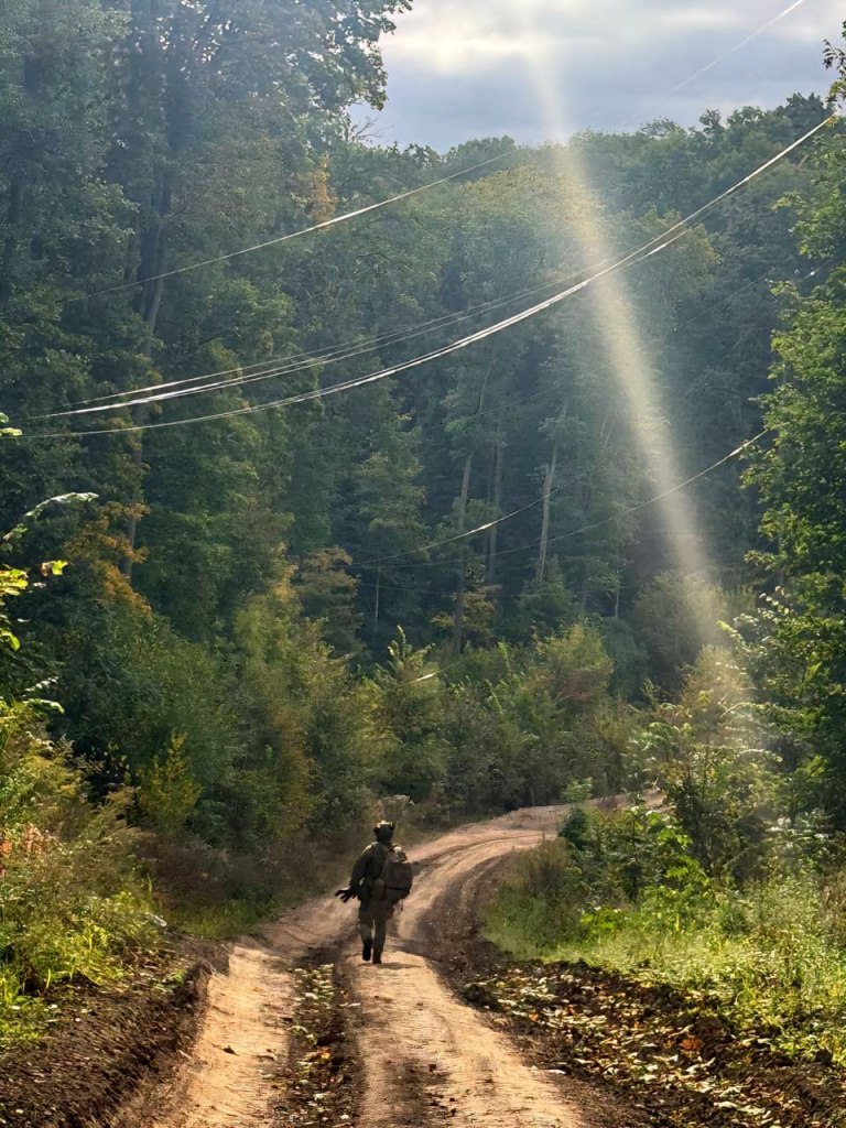 Ein ukrainischer Soldat geht unter vielen an Bäumen hängenden Glasfaserkabeln von FPV-Drohnen, September 2025 (c) soziale Netzwerke