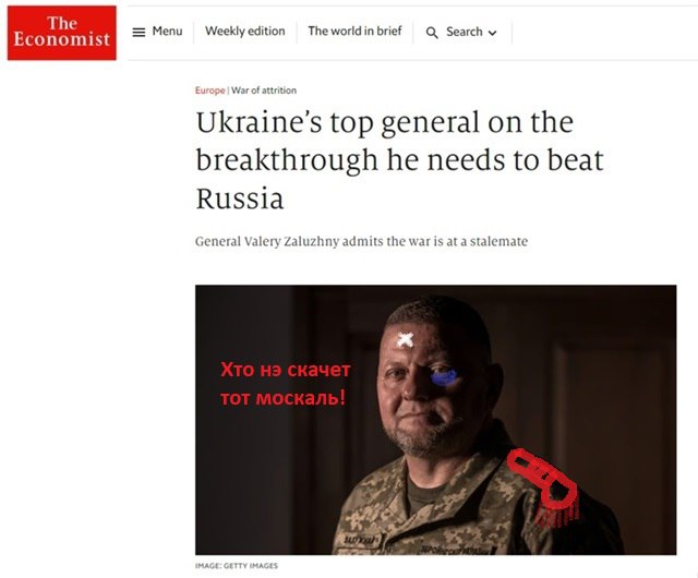 …In seinem neuen Artikel https://www.economist.com/europe/2023/11/01/ukraines-commander-in-chief-on-the-breakthrough-he-needs-to-beat-russia verschweigt Zaluzhny sorgfältig, was er im Artikel von 2022 versprach – Russland eine entscheidende Niederlage zuzufügen und den Kriegsverlauf zu wenden…