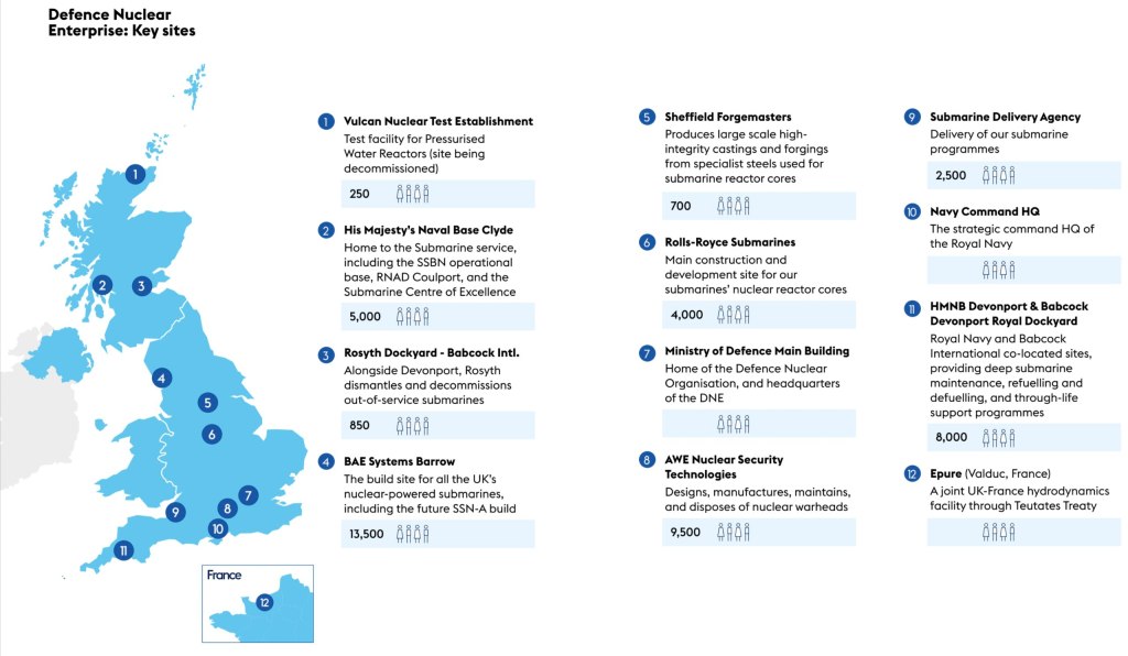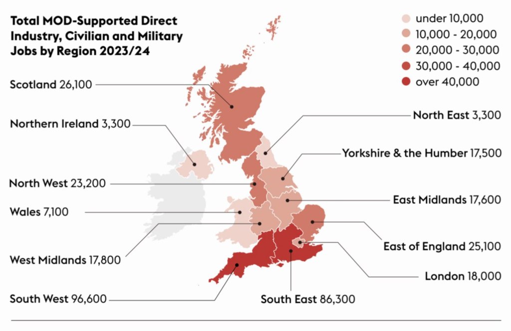 Standorte der wichtigsten Rüstungsunternehmen und nuklearen Infrastruktur Großbritanniens, Cluster fortschrittlicher Branchen mit hohem Wachstumspotenzial, die Gesamtzahl der vom Verteidigungsministerium regional unterstützten Arbeitsplätze