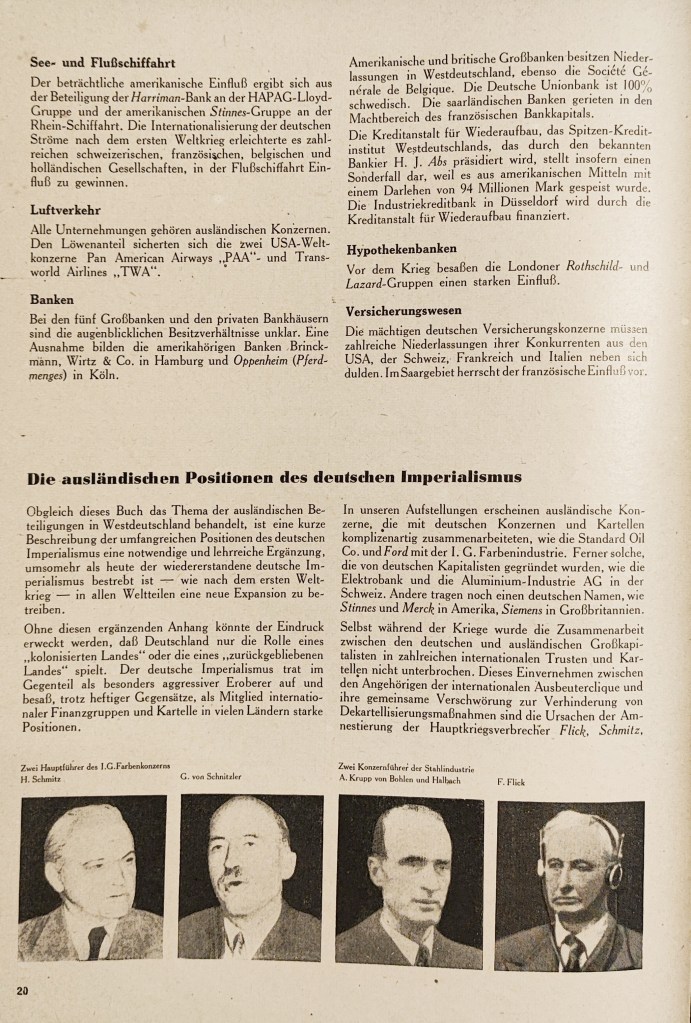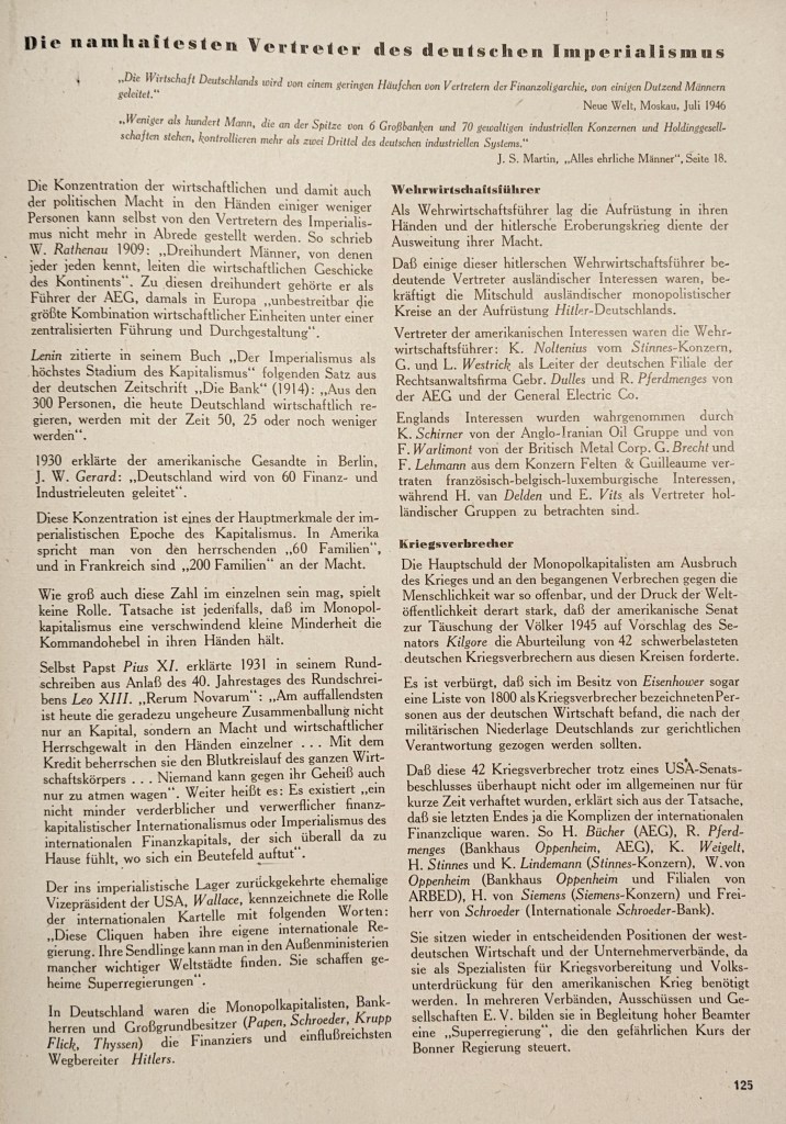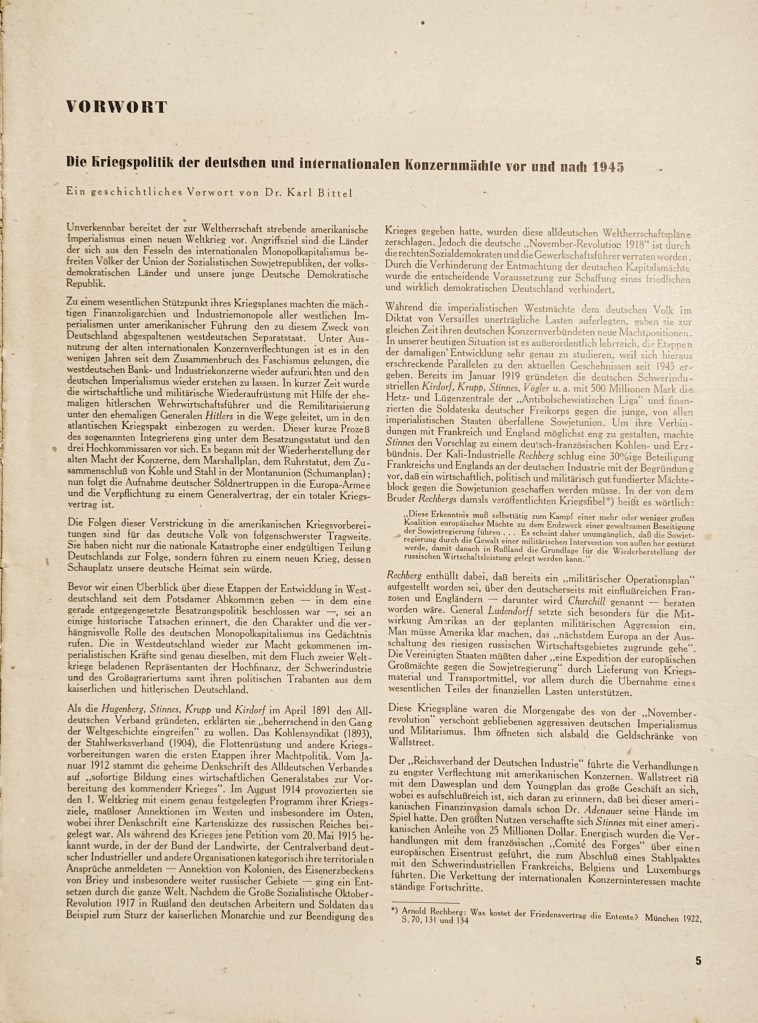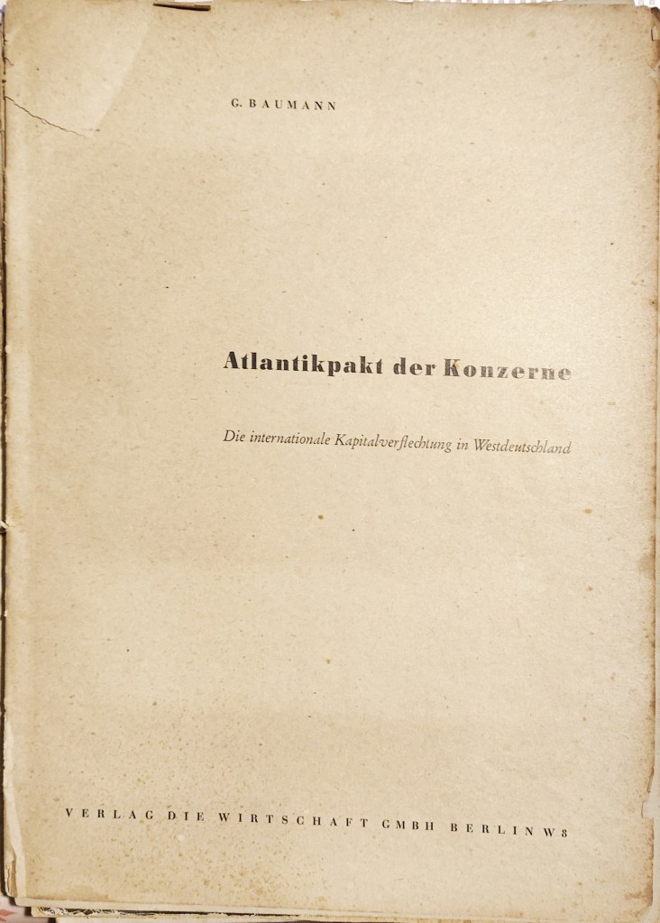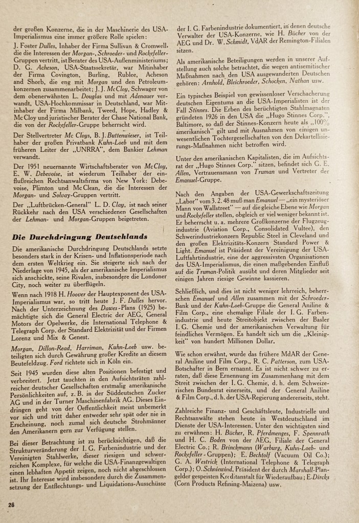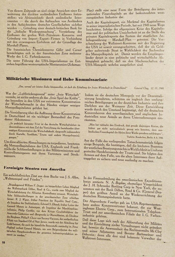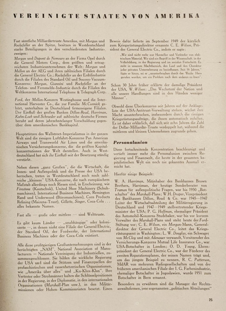 Der aggressive Atlantikpakt, die Verschwörung des internationalen Finanzkapitals gegen den Frieden, ist ein Pakt der Konzerne mit dem Ziel die Sicherung ihrer westdeutschen Beteiligungen und der Rückeroberung ihrer Positionen in den Ländern, die sich von der monopolkapitalistischen Bevormundung befreit haben.
