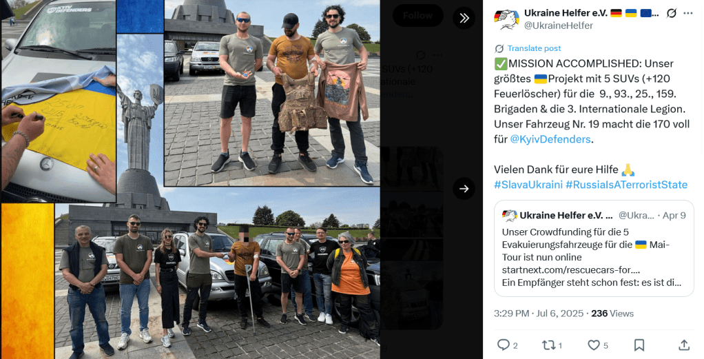 Projekt mit 5 SUVs (+120 Feuerlöscher) für die 9., 93., 25., 159. Brigaden & die 3. Internationale Legion. Unser Fahrzeug Nr. 19 macht die 170 voll für @KyivDefenders
