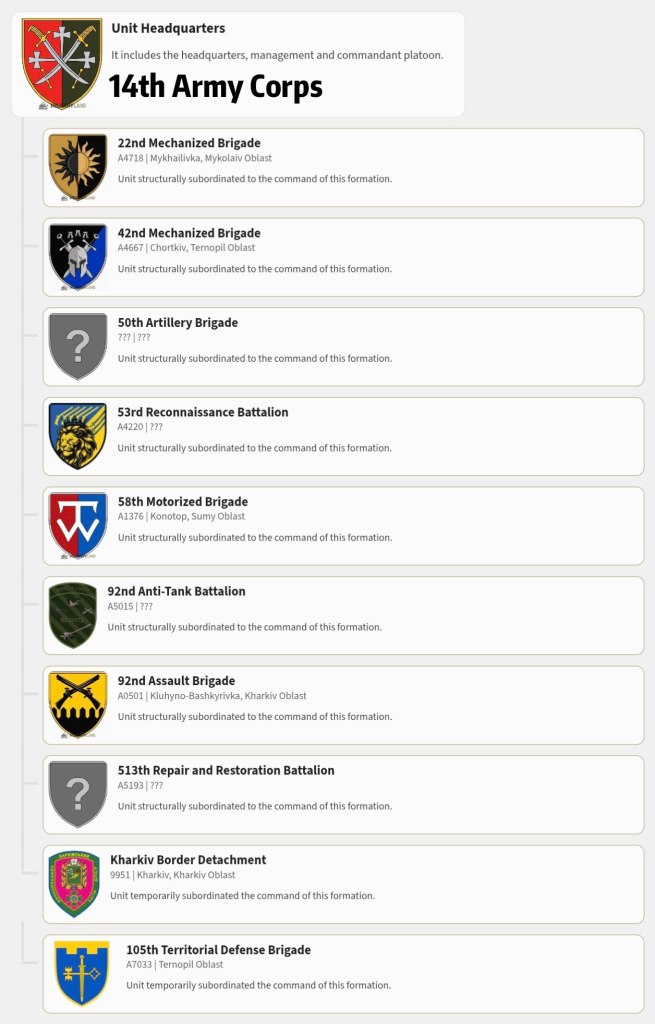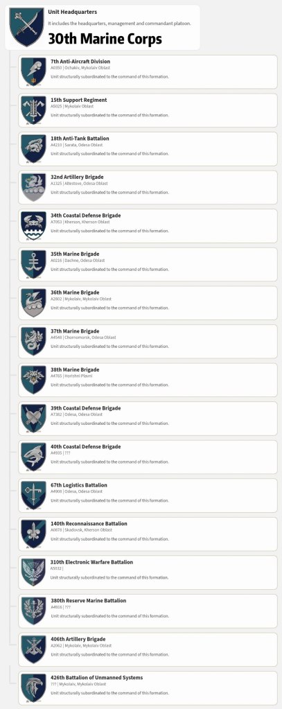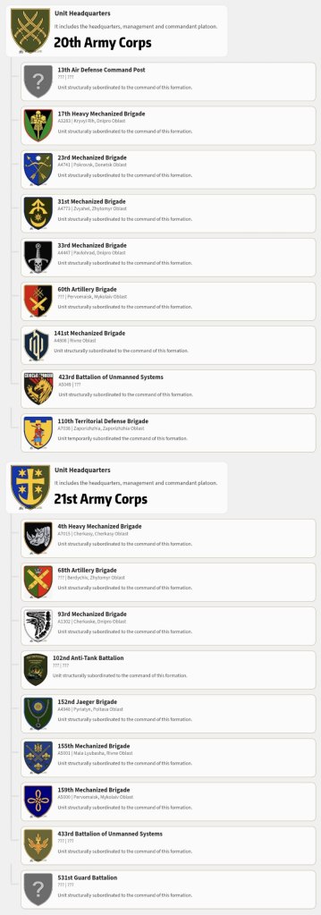 Korps der Nationalgarde, 2025; 2. Korps der Nationalgarde, 2025; 3. Armeekorps, 2025; 7. Korps der Luftlandetruppe, 2024; 8. Korps der Luftlandetruppe, 2025; 9. Armeekorps, 2023; 10. Armeekorps, 2022; 11. Armeekorps, 2023; 12. Armeekorps, 2023; 14. Armeekorps, 2023; 15. Armeekorps, 2023; 16. Armeekorps, 2025; 17. Armeekorps, 2023; 18. Armeekorps, 2022; 19. Armeekorps, 2023; 20. Armeekorps, 2023; 21. Armeekorps, 2023; 30. Korps der Marineinfanterie, 2023.