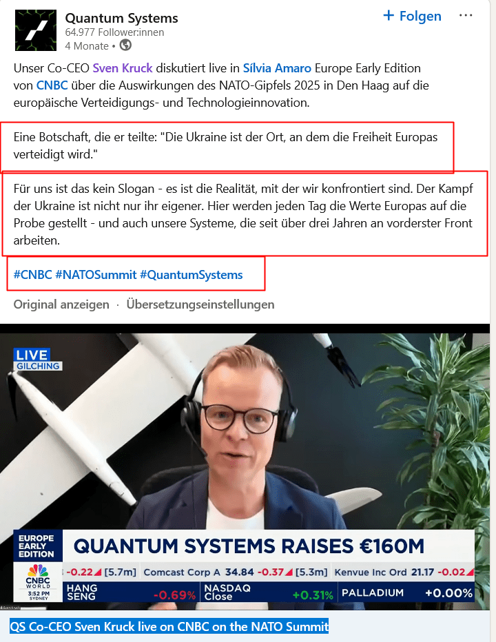 Amerikanische und israelische Unternehmen haben den Drohnenmarkt historisch dominiert. Wir freuen uns, dass Quantum-Systems sich verstärkt und eine selbst entwickelte europäische Lösung bietet, die die Technologiequalität nicht opfert.