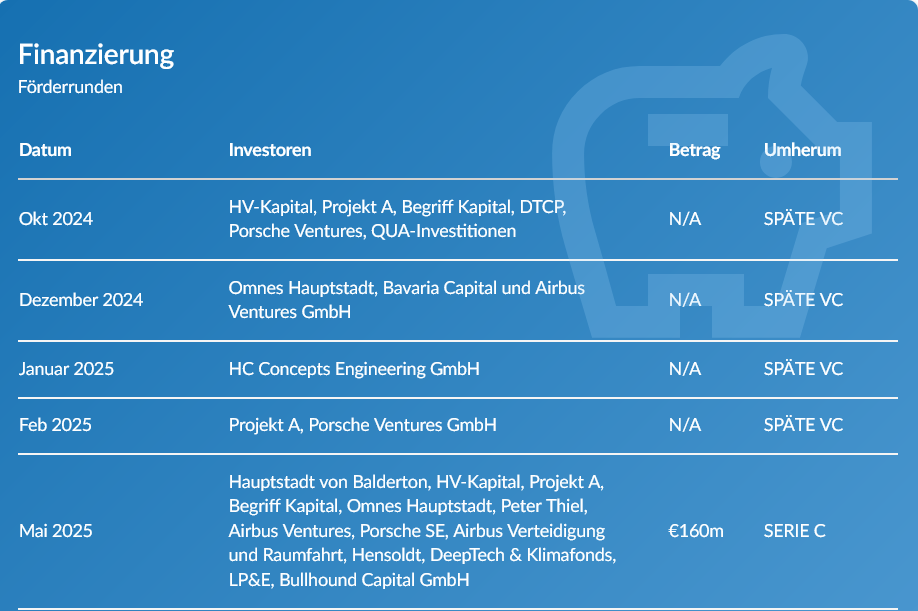 Investoren stehen Schlange. Zu den Geldgebern zählen Peter Thiel, HV Capital, Project A, die 10x Group, Porsche SE, Hensoldt und Airbus. Schon im Frühjahr flossen 160 Millionen Euro, die Bewertung stieg auf eine Milliarde Euro.