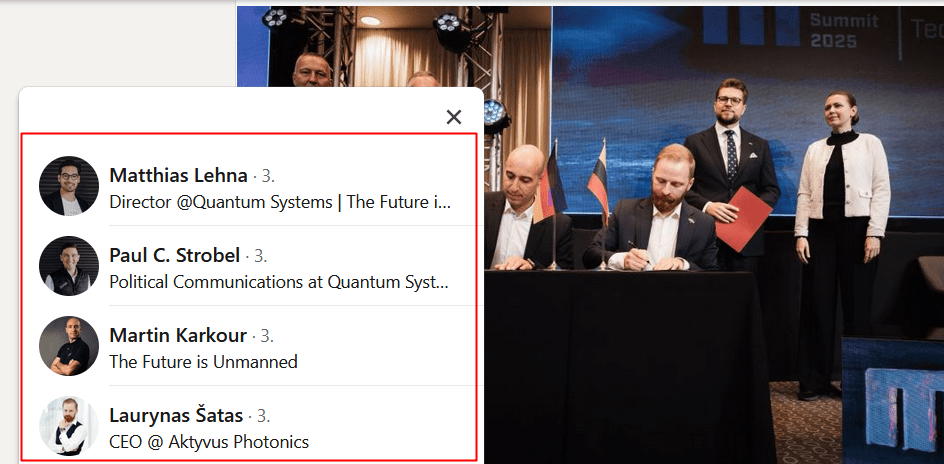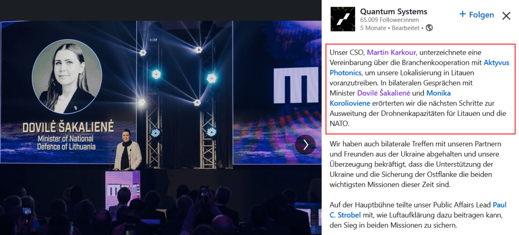 Der CSO von Quantum Systems, Martin Karkour, und der CEO von Aktyvus Photonics, Laurynas Šatas, hatten die Ehre, die Absichtserklärung in Anwesenheit von Verteidigungsminister Dovilė Šakalienė, Wirtschaftsminister Lukas Savickas, dem deutschen Botschafter Dr. Cornelius Zimmermann und Vizeadmiral Carsten Stawitzki zu unterzeichnen – und ein Briefing über die Zusammenarbeit mit Ministerin Šakalienė und Senior Advisor, Monika Korolioviene, zu halten.