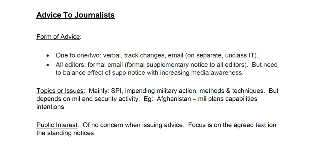 Der Ausschuss gibt auch routinemäßig sogenannte „D-Notizen“ heraus, die Medien auffordern, ihren „Rat“ zu suchen, bevor sie bestimmte Geschichten berichten, oder einfach nur zu fragen, ob sie bestimmte Themen direkt vermeiden.