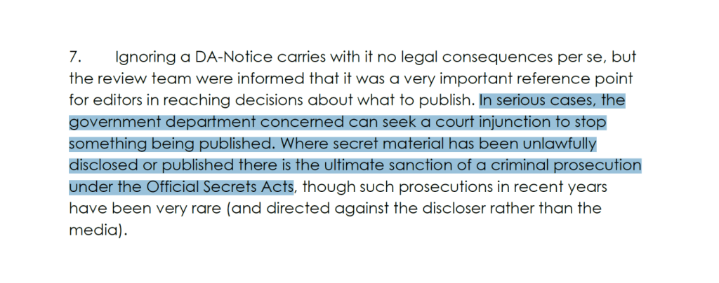 Die interne Überprüfung des Komitees von 2015, die durch die Edward-Snowden-Affäre ausgelöst wurde, erklärte, wie „in schweren Fällen“ die britische Regierung „eine einstweilige Verfügung beantragen“ oder Journalisten strafrechtlich verfolgen kann, die gegen den Rat des Komitees nach dem Official Secrets Act verstoßen – ein Punkt, den der DSMA-Sekretär Brigade.
