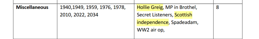 „Verschiedene“ Anfragen während dieser Zeit beinhalteten einen Parlamentarier, der ein Bordell besuchte, „schottische Unabhängigkeit“ und den Fall von Hollie Greig, einer Frau mit Down-Syndrom, die behauptete, sie sei Opfer eines Kindesmissbrauchsrings mit einflussreichen schottischen Persönlichkeiten, einschließlich Polizei, Richtern und anderen prominenten Personen.