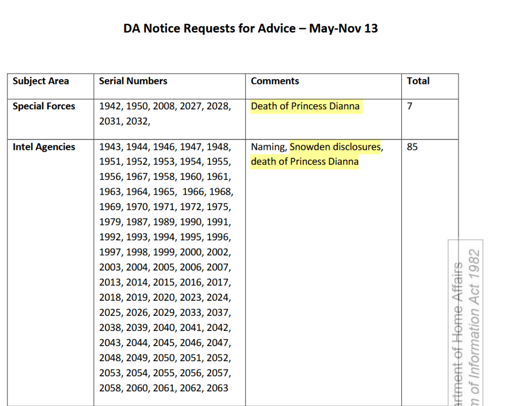 Unglaublicherweise tauchten insgesamt 85 „Intel-Agentur“ Anfragen zu Dianas Tod und den Enthüllungen des NSA-Leakers Edward Snowden auf.