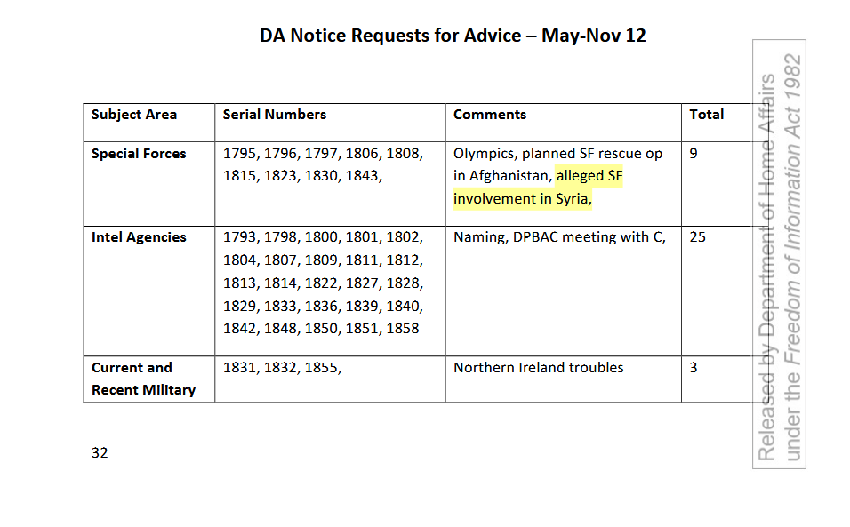 Die Aufzeichnungen heben einen Journalisten hervor, der erfolgreich unter Druck gesetzt wurde, keine Informationen über eine britische Armeeeinheit zu veröffentlichen, die „im Begriff ist, Operationen im Ausland zu entsenden“, in einem unerklärten Land. Trotz der Einhaltung argumentierte der Journalist, dass die Präsenz der britischen Streitkräfte in der Region „weithin bekannt“ war im Land selbst, „Teil einer sehr großen internationalen Koalitionsbemühung“ war und „es Open-Source-Beweise gab, um es zu beweisen“.