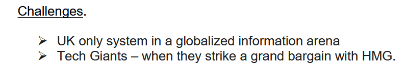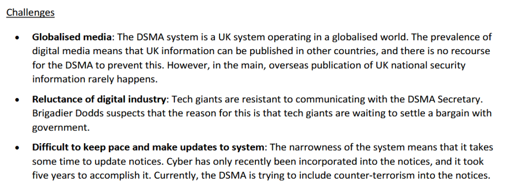 Ein schriftliches Briefing stellte fest, dass die britische DSMA das „einzige [solche] System in einer globalisierten Informationsarena“ sei, und beschrieb die Notwendigkeit, dass die „Tech-Giganten“ „ein großes Abkommen mit der britischen Regierung als eine ihrer anhaltenden „Herausforderungen“ treffen müssen.