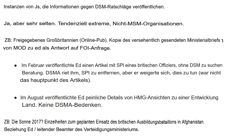 Deklassifiziertes Vereinigtes Königreich, das vom Ausschuss als „extrem“ gebrandmarkt wird, ist besonders beunruhigend, da ein anderer Artikel, der von der Verkaufsstelle veröffentlicht wurde, der „peinliche Details der Ansichten der britischen Regierung zu einem Entwicklungsland“ enthüllte, auch in dem Briefing aufgeführt ist, mit dem Vorbehalt, dass der Artikel „keines DSMA-Anliegens“ war.