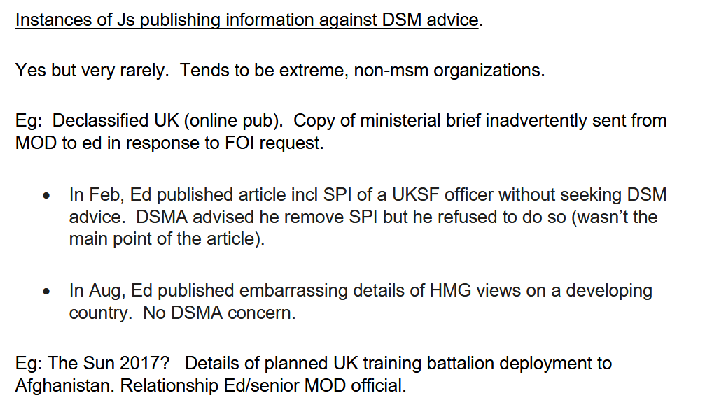 Das Outlet überquerte wiederholt das Komitee, indem es über eine „Kopie des Ministerialbriefs“ berichtete, die versehentlich vom MOD an den Herausgeber der Website gesendet wurde, als Reaktion auf eine FOI-Anfrage, sowie einen Artikel veröffentlichte, in dem ein britischer Spezialeinheitsoffizier benannt wurde, „ohne DSMA-Rat zu suchen“.