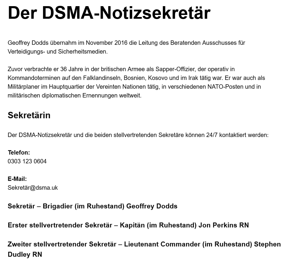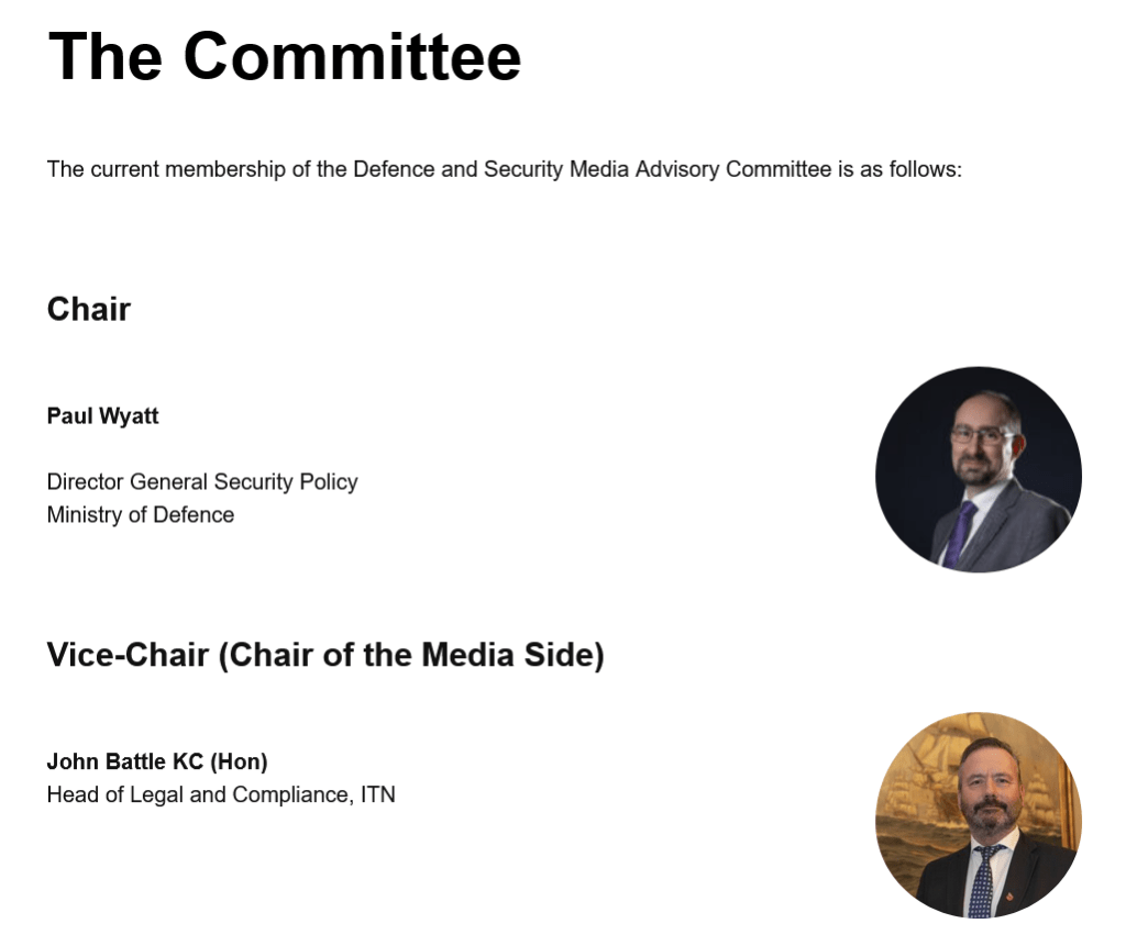 Das DSMA-Komitee wird vom britischen Verteidigungsministerium (MOD) dem Vorsitz des MOD-Generaldirektors für Sicherheitspolitik Paul Wyatt und untergebracht, und der 36-jährige britische Armee-Veteran Brigadier Geoffery Dodds dient als sein Sekretär und wirft ernsthafte Fragen darüber auf, inwieweit britische „Nachrichten“ über die nationale Sicherheit effektiv vom Verteidigungsministerium geschrieben werden könnten.