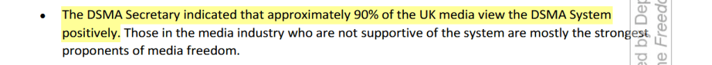 „Der DSMA-Sekretär gab an, dass etwa 90% der britischen Medien das DSMA-System positiv sehen“, heißt es in dem Bericht und fügt hinzu, dass die wenigen abtrünnigen Journalisten, „die das System nicht unterstützen“, „meist die stärksten Befürworter der Medienfreiheit“ sind.