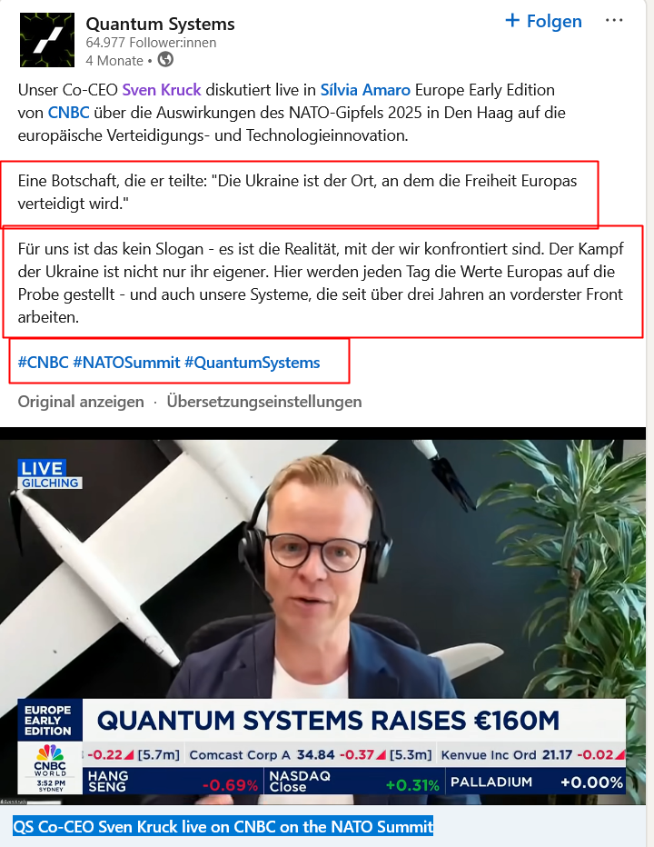 Новые оборонные компании формируют будущее современной войны: содиректор Quantum Systems Свен Крук в прямом эфире CNBC с саммита НАТО https://www.cnbc.com/video/2025/06/26/new-defence-companies-shaping-this-era-of-modern-warfare–quantum-systems-co-ceo.html