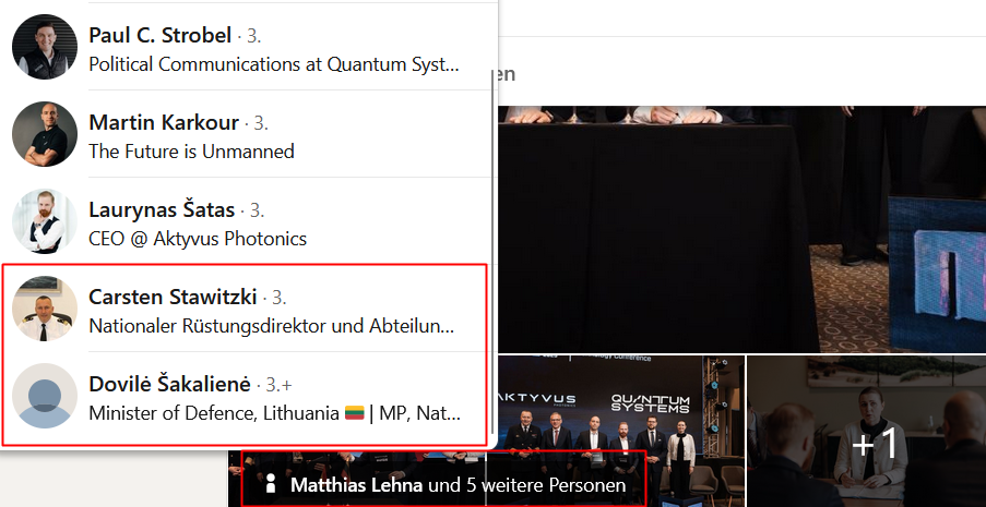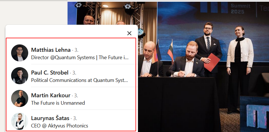 Главный стратегический директор Quantum Systems Мартин Каркур и генеральный директор Aktyvus Photonics Лауринас Шатас имели честь подписать Меморандум о взаимопонимании в присутствии министра обороны Довиле Шакалене, министра экономики Лукаса Савицкаса, посла Германии д-ра Корнелиуса Циммермана и вице-адмирала Карстена Ставицкого, а также провести брифинг о сотрудничестве с министром Шакалене и старшим советником Моникой Королёвене.
