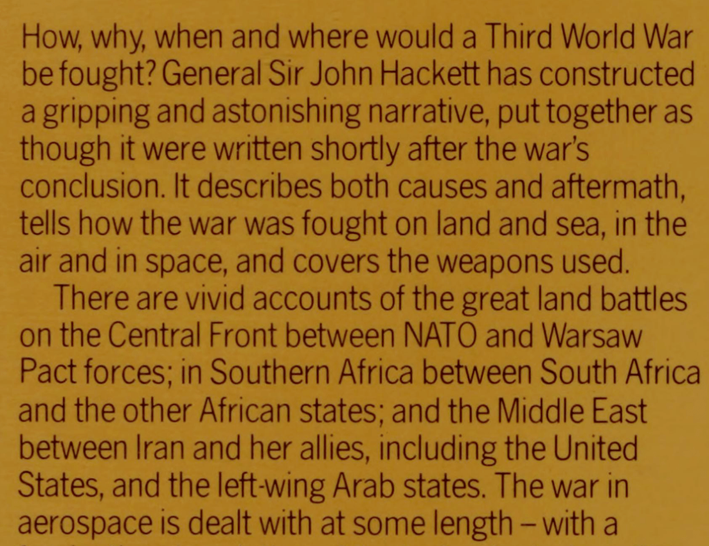 Hackett sagt eine katastrophale Niederlage Moskaus voraus, aber die «alte Garde» im Kreml beschränkt sich in den letzten Stunden der «Niederlage» auf den Einsatz einzelner nuklearer Munition im englischen Birmingham, ohne die Sache zu einer umfassenden nuklearen Apokalypse zu bringen. Der Rezensent hält das für unlogisch für ein verzweifeltes Management.