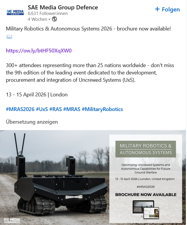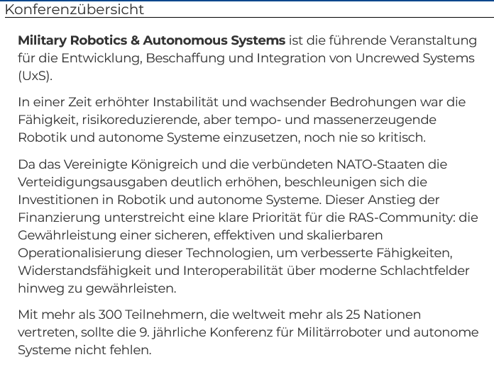 С участием более 300 человек, представляющих более 25 стран мира, 9-я ежегодная конференция по военной робототехнике и автономным системам является обязательным мероприятием.