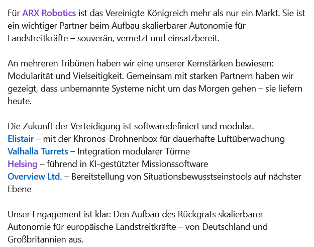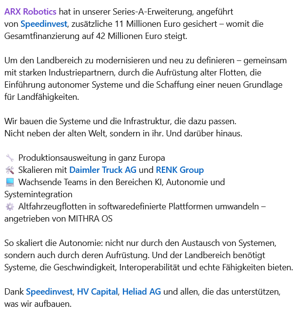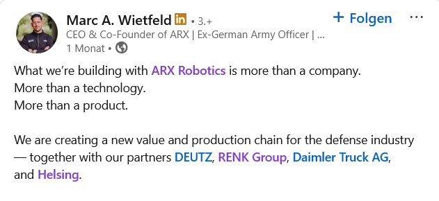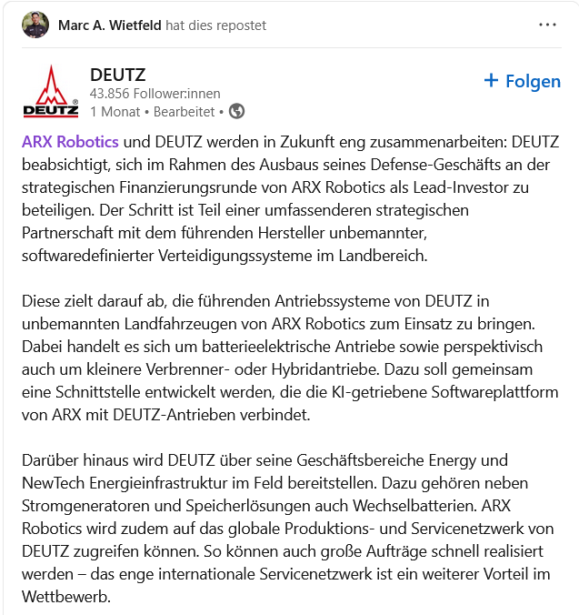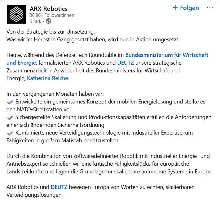 ARX Robotics и DEUTZ будут тесно сотрудничать в будущем: DEUTZ намерена выступить ведущим инвестором в стратегическом раунде финансирования ARX Robotics в рамках расширения своего оборонного бизнеса. Этот шаг является частью всеобъемлющего стратегического партнерства с ведущим производителем беспилотных наземных оборонных систем с программным управлением.