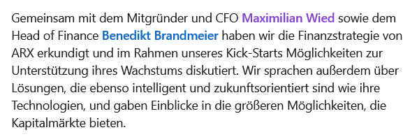 Вместе с соучредителем и финансовым директором Максимилианом Видом и руководителем финансового отдела Бенедиктом Брандмайером мы изучили финансовую стратегию ARX и в рамках нашей первой встречи обсудили способы поддержки их роста. Мы также поговорили о решениях, столь же интеллектуальных и ориентированных на будущее, как и их технологии, и поделились своими соображениями о более широких возможностях, предлагаемых рынками капитала.