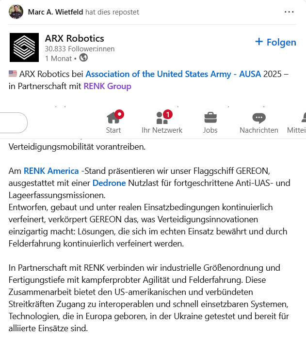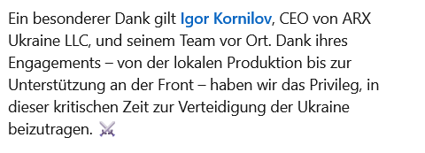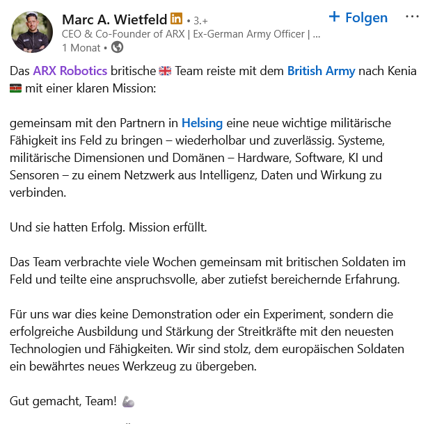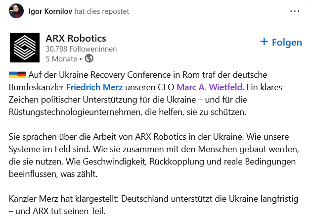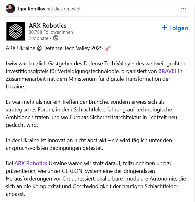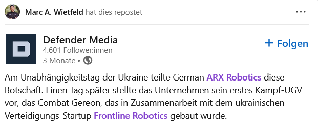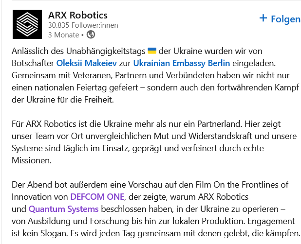 Компания ARX Robotics поделилась этим сообщением в День независимости Украины. Днем позже компания представила свой первый боевой беспилотный наземный аппарат Combat Gereon, разработанный в сотрудничестве с украинским оборонным стартапом «Frontline Robotics».