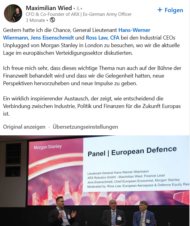 Вчера мне довелось встретиться с генерал-лейтенантом Хансом-Вернером Вирманном, Йенсом Айзеншмидтом и Россом Лоу, CFA, на мероприятии Morgan Stanley Industrial CEOs Unplugged в Лондоне, где мы обсудили текущую ситуацию в европейском оборонном секторе.