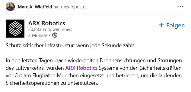 В последние дни, после неоднократных наблюдений беспилотников и сбоев в воздушном движении, сотрудники службы безопасности аэропорта Мюнхена развернули и использовали системы ARX Robotics для поддержки текущих операций по обеспечению безопасности.