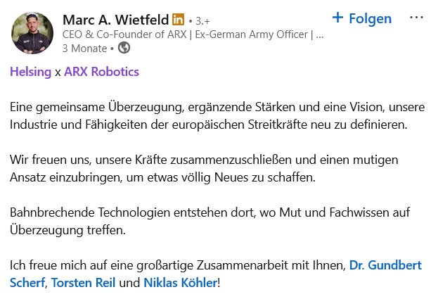 «Мы рады приветствовать Кьяран, Фолькера и Петера в команде менеджеров ARX. Их совместный опыт и глубокие знания будут способствовать нашей международной экспансии, помогут нам справиться с ее сложностями и значительно повысят технологическое превосходство ARX, что позволит нам предоставлять масштабируемые оборонные решения нового поколения европейским вооруженным силам и Украине».