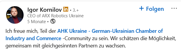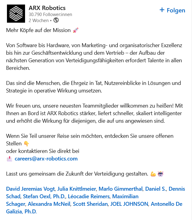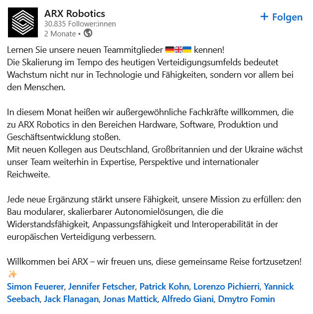 В этом месяце к ARX Robotics присоединяются выдающиеся специалисты в области аппаратного и программного обеспечения, производства и развития бизнеса. Благодаря новым коллегам из Германии, Великобритании и Украины, наша команда продолжает расти в экспертизе, расширении кругозора и международном охвате.