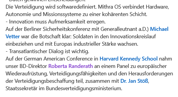 Это включало модерацию панельной дискуссии по программно-определяемой обороне с участием полковника Михаэля Петера Йегера (Федеральное министерство обороны Германии), Филиппа Бартковски (Project Q) и Антье Венякоб (Avtonomy GmbH), а также проведение презентации стартапов, полных свежих идей для оборонной экосистемы, от ADA BW, LiveEO, Quantum Optics Jena GmbH и Cerepal.ai.