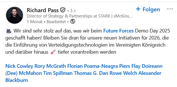 Richard Pass (McKinsey&Company, ARX Robotics, British Army) Direktor für Strategie und Partnerschaften bei STARK / xMcKinsey / Atlantic Council Millennium Fellow | Mitbegründer von Future Forces