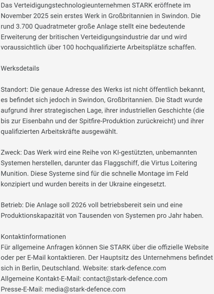 Die deutsche Rüstungsfirma Stark produziert jetzt Strike-Drohnen im britischen Swindon. Es handelt sich um ihre erste Fertigungsstätte außerhalb Deutschlands.