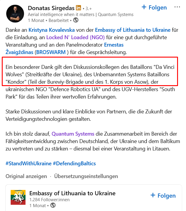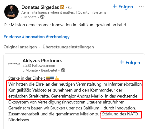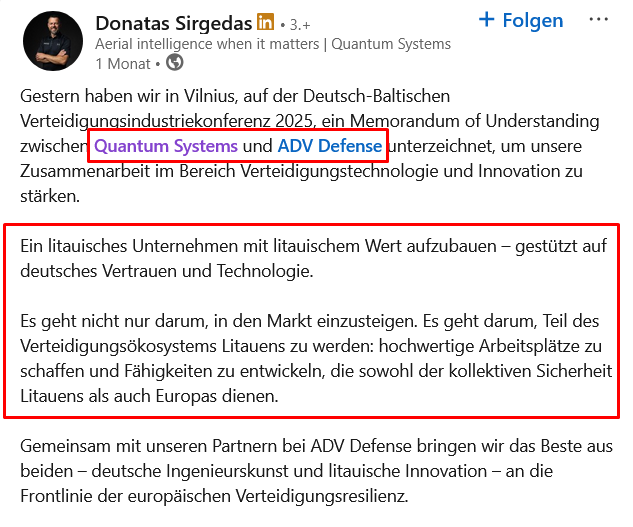 Вчера в Вильнюсе, на Германо-балтийской конференции оборонной промышленности 2025, мы подписали Меморандум о взаимопонимании между Quantum Systems и ADV Defense для укрепления нашего сотрудничества в области оборонных технологий и инноваций.