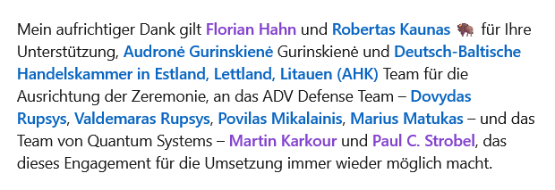 Моя искренняя благодарность Florian Hahn и Robertas Kaunas за вашу поддержку, Audronė Gurinskienė Гуринскене и Deutsch-Baltische Handelskammer in Estland, Lettland, Litauen (AHK) команде за проведение церемонии, команде ADV Defense — Dovydas Rupsys, Valdemaras Rupsys, Povilas Mikalainis, Marius Matukas — и команде Quantum Systems — Martin Karkour и Paul C. Strobel за то, что снова и снова делают возможным это обязательство по исполнению.